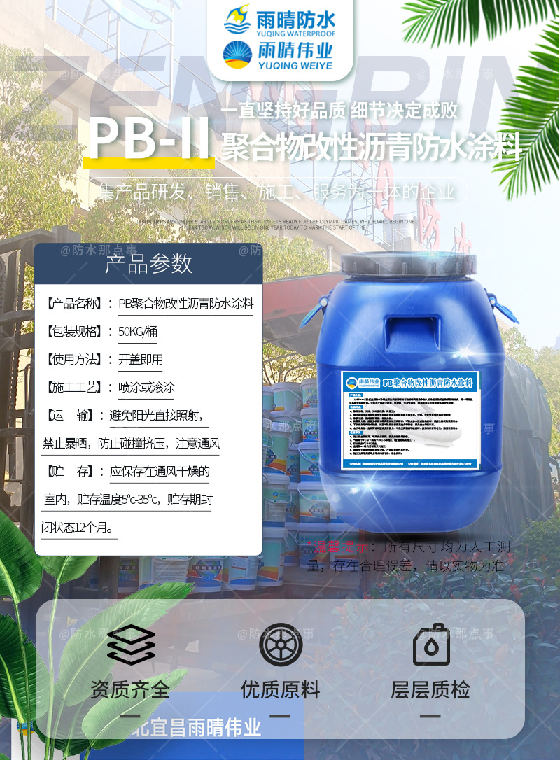 雨晴防水十堰房县PB聚合改性沥青防水涂料销售厂家是一家生产、销售各种PB-2改进型道桥防水粘结层、PY型路面防裂卷材、PB高聚物桥面防水涂料、高弹性水固化注浆液、热塑性聚烯烃防水卷材、自粘高分子防水卷材、PB-1改进型聚合物防水涂料、水性环氧改性沥青桥面防水涂料、PB-I纤维增强型防水粘结层的厂家、经过近多年的顺势发展,不断扩大规模,坚持以科学的管理和严格的检验制度,确保产品的精良。雨晴防水提供研发、生产、销售及施工服务,深的广大新老客户的一致好评。雨晴防水技术力量雄厚,工艺流程科学,质量检测体系完善,采用特选的原材料,严把质量关,我们一直是以“质量精良、交货及时、价格合理、服务周到”宗旨来为广大客户服务的;并且坚持“质量求生存,信誉谋发展的原则”,是企业与客户共同成长。雨晴防水十堰房县PB聚合改性沥青防水涂料销售厂家愿为十堰房县PB-2改进型道桥防水粘结层客户提供合格的产品和满意的服务。并真诚欢迎各地的朋友前来洽谈业务。愿与每位客户携手并进共创美好未来。
