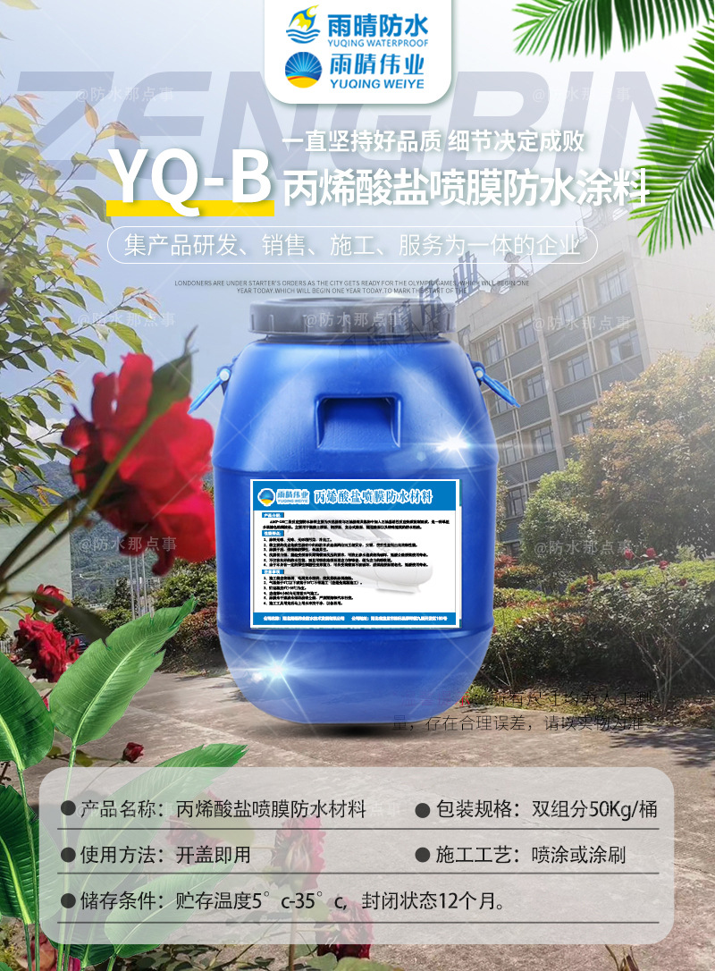 雨晴防水专注丙烯酸盐喷膜防水涂料上十年,长期供应丙烯酸盐喷膜防水涂料,我公司集开发、研究、生产、销售、施工于一体,生产过程监管严格,生产质量过硬,如有需要长葛丙烯酸盐喷膜防水涂料请您及时联系我们:曾工,我们的技术人员将详细为您解答!
