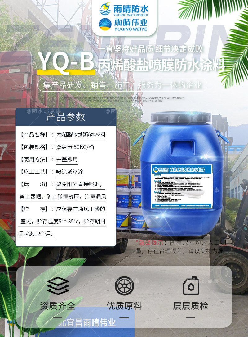 雨晴伟业四川成都丙烯酸盐喷膜防水材料销售厂家是一家生产双组分丙烯酸盐喷膜的厂家、双组分丙烯酸盐喷膜、PBR水性沥青基道桥防水涂料、蠕变型高分子橡胶沥青自粘防水卷材、GS溶剂型粘结剂、K11聚合物水泥基渗透结晶浓缩剂、渗透结晶型抗渗防水涂料、PBL-2道桥防水涂料、喷涂速凝道桥防水涂料、DPS-3防水防腐剂的厂家,能够充分满足客户的要求。雨晴伟业以的良好信誉而傲视同行,产品不断创新、追求精品,设计施工可满足客户的各种要求。现拥有生产车间和施工施工队,以科学高校的管理基础,以高质量的产品为依托,可来样定做加工专注的生产厂家,雨晴伟业拥有完整、科学的质量管理体系。雨晴伟业的诚信、实力和产品质量获得业界的认可。欢迎各界朋友莅临雨晴伟业参观、指导和业务洽谈。