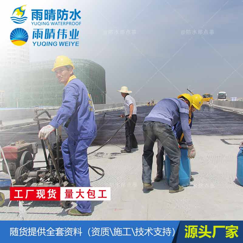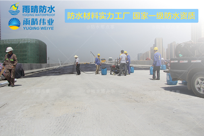 (1)雨晴伟业双组分丙烯酸盐喷膜防水材料是一种采用优良工艺,将超细、悬浮、微乳化的改性阴离子乳化沥青和合成高分子聚合物配置而成(A组分),再与特种固化剂(B组分)混合、反应后生成的一种性能优异的防水、防腐涂料;实干后可以形成一种致密、连续、完整,具有很高的伸长率、优异的耐久性,且具有防水、防腐、防渗、防护作用的橡胶沥青涂层,一次喷涂可达到2mm以上厚度,且施工速度快、环保。