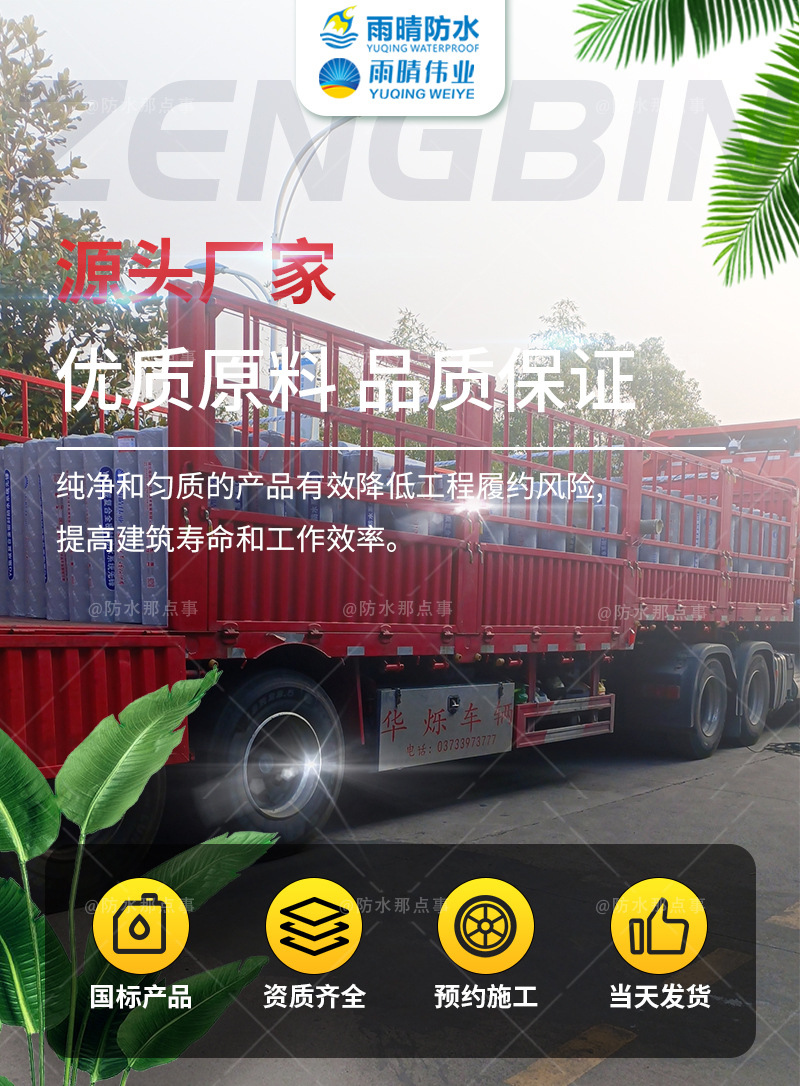 天门侨乡高分子反应型自粘防水卷材销售厂家是一家生产TQF化聚防水卷材的厂家、TQF化聚防水卷材、PB-2改性沥青防水粘结层、PB改进型聚合物防水粘结层、PB-2水性沥青基道桥防水涂料、喷涂速凝液体橡胶防腐涂料、FYT-2改进型聚合物桥面防水涂料、水基渗透结晶型防水涂料、EVA多功能弹性防水涂料、喷涂速凝道桥防水涂料的厂家,能够充分满足客户的要求。雨晴防水以的良好信誉而傲视同行,产品不断创新、追求精品,设计施工可满足客户的各种要求。现拥有生产车间和施工施工队,以科学高校的管理基础,以高质量的产品为依托,可来样定做加工专注的生产厂家,雨晴防水拥有完整、科学的质量管理体系。雨晴防水的诚信、实力和产品质量获得业界的认可。欢迎各界朋友莅临雨晴防水参观、指导和业务洽谈。