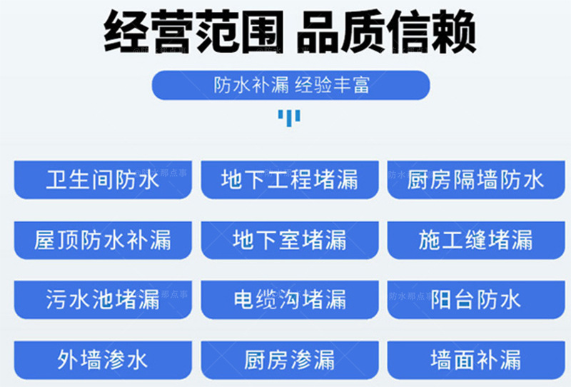 车库防水公司有众多防水经验丰富的老师傅,擅长建筑疑难渗漏的修补,雨晴防水阳台防水补漏维修,外墙漏水处理,下水管周围防水修缮等;由于从事防水行业多年,施工技术成熟,管理经验足,大幅降低了施工成本,可解决各种房屋漏水问题。