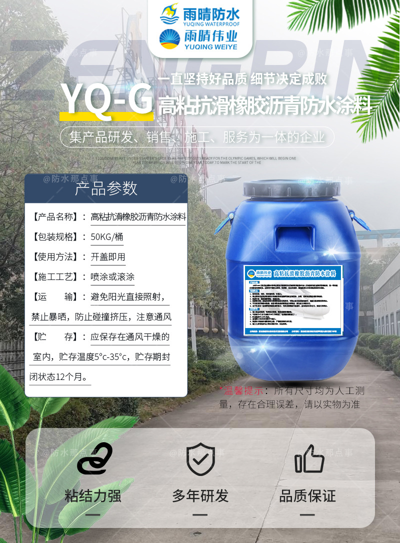 雨晴防水禹州高粘抗滑橡胶沥青防水涂料销售厂家生产高粘抗滑水性橡胶沥青防水涂料、FYT-1改性沥青道桥防水涂料、PBL-2改性沥青防水涂料、FYT-II高聚物道桥防水粘结层、水性混凝土复合防腐防水剂、喷涂速凝液体橡胶防腐涂料、SBS改性沥青耐根穿刺防水卷材、水性渗透型无机防水剂、JS聚合物修补堵漏剂涂料等产品,是致力于生产销售生产厂家,规格多种多样,拥有大批管理,研发及技术人员和先进的生产设备。根据我国高粘抗滑水性橡胶沥青防水涂料的现状和发展趋势,设计开发出数种高粘抗滑水性橡胶沥青防水涂料及配套品。我们坚持科技就是企业发展生产力,重管理,重创新,重技术,重质量.通过多年努力,使产品具有外形美观、耐腐蚀、不易老化、表面平整、光泽度高、颜色不易掉落等特点。愿以实惠的价格和可靠的质量,本着“以质量求生存,以信誉求发展,以管理求效益,以开拓求创新”的宗旨,欢迎四海宾朋光临指导,携手共创美好明天!