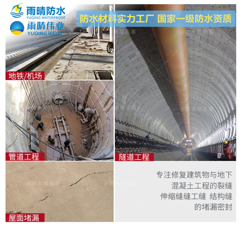 (1)整体密贴无缝性能 丙烯酸盐灌浆料是一种双组分的液体防水涂膜,防水层在快速聚合过程中形成的完整的皮肤式防水层,能够与复杂不平的基面形成牢固的粘接,并且潮湿基面也不影响防水材料的聚合与粘接性能,能与防护基材形成致密的防水层,无空腔不穿水。