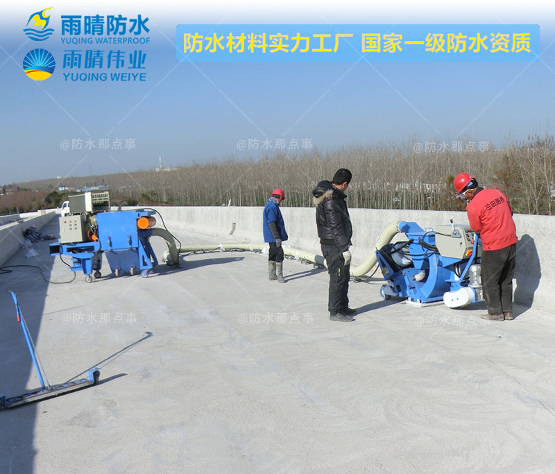 (4)基层处理:桥面不得有尘土、浮灰、杂质、油渍等,铺防水层前可用空压机、净水、去油剂等将表面处理干净,如有混凝土、沙浆等结硬杂物,应将其打磨掉。