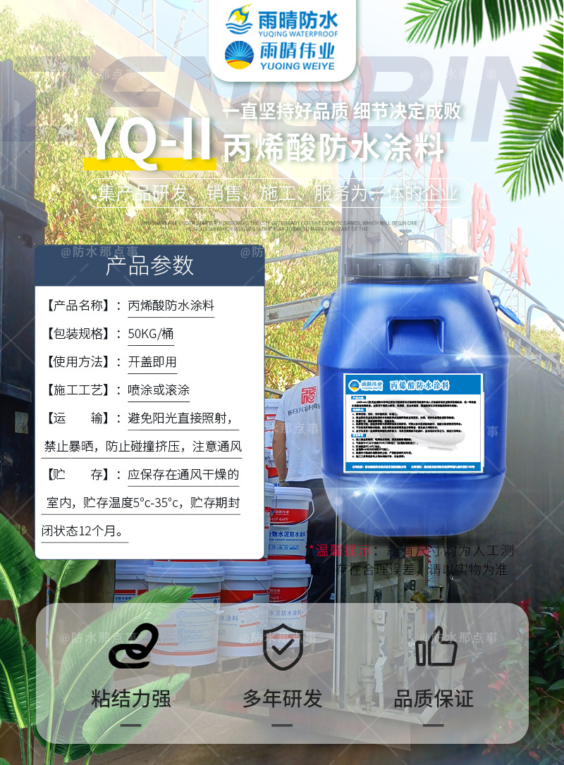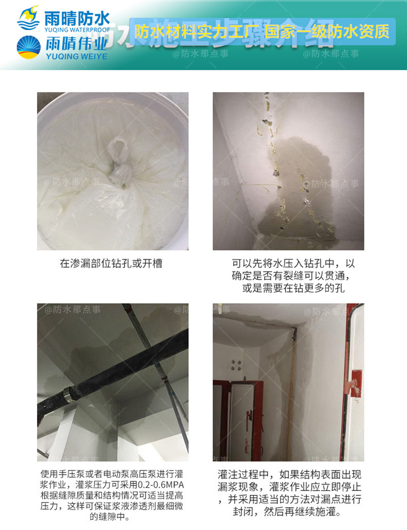 潜江熊口农场丙烯酸灌浆防水涂料销售厂家是一家生产、销售各种纯丙烯酸盐注浆料、蓄水池硅烷浸渍防水涂料、PB高聚物防水涂料、PB聚合物桥面防水粘结层、高分子蠕变型橡胶自粘防水卷材、高渗透环氧防水粘结层、PB-1改进型聚合物防水涂料、PB-I改进型高聚物防水涂料、PBR-1高聚物桥面防水涂料的厂家、经过近多年的顺势发展,不断扩大规模,坚持以科学的管理和严格的检验制度,确保产品的精良。雨晴伟业提供研发、生产、销售及施工服务,深的广大新老客户的一致好评。雨晴伟业技术力量雄厚,工艺流程科学,质量检测体系完善,采用特选的原材料,严把质量关,我们一直是以“质量精良、交货及时、价格合理、服务周到”宗旨来为广大客户服务的;并且坚持“质量求生存,信誉谋发展的原则”,是企业与客户共同成长。潜江熊口农场丙烯酸灌浆防水涂料销售厂家愿为潜江熊口农场纯丙烯酸盐注浆料客户提供合格的产品和满意的服务。并真诚欢迎各地的朋友前来洽谈业务。愿与每位客户携手并进共创美好未来。