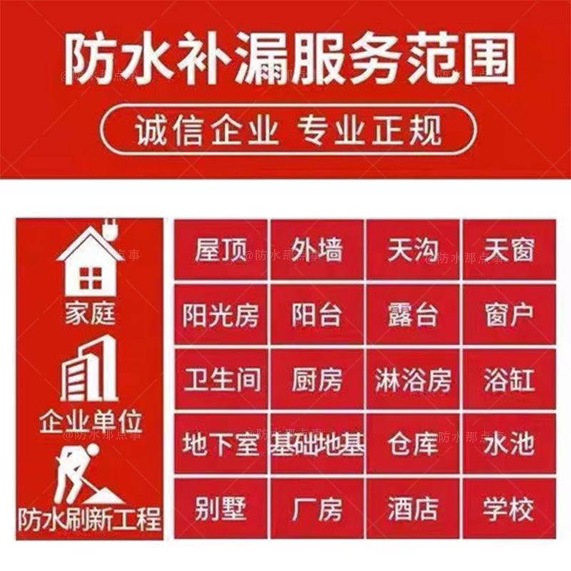 涵洞防水与漏水维修是两个不同的概念。涵洞防水与漏水维修服务相比,通常施工范围更大一些。我司涵洞防水主要业务有毛坯防水、装修防水、楼房顶防水、卫浴防水等。漏水维修漏主要有家庭卫生间、屋顶、外墙、飘窗、阳台、地下室、阳光房、露台、天沟、厨房、淋浴室、天台等位置的漏水维修及堵漏。除了施工范围广,我司还配备了各种的检测漏水设备及施工器材,基本能解决一切漏水难题,不存在我们干不了的防水业务。