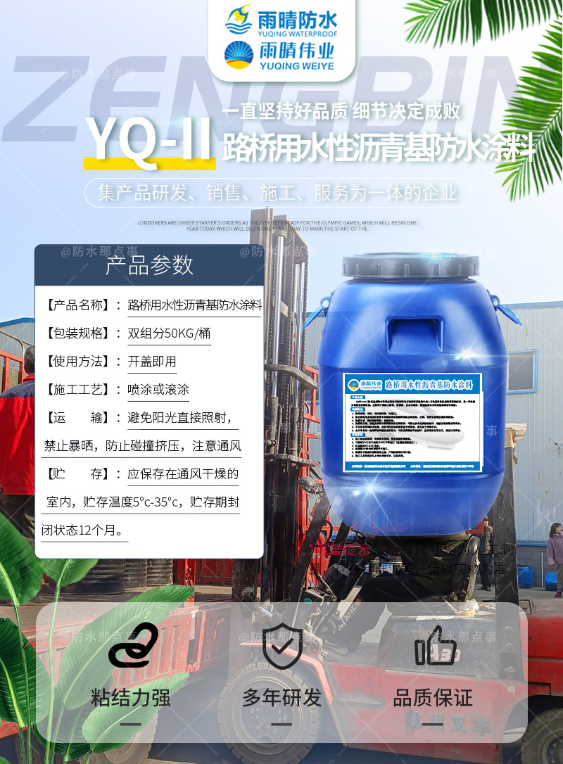 雨晴伟业晋江水性沥青基防水涂料销售厂家是一家生产、销售各种水性沥青桥面防水涂料、FYT-II高聚物桥面防水涂料、PB-2改进型高聚物防水粘结层、FYT水性沥青基防水涂料、PB改进型桥面防水涂料、PBR-1改进型聚合物防水涂料、JBS纤维增强型防水涂料、PBL聚合物道桥防水涂料、纳米渗透型防水剂的厂家、经过顺势发展,不断扩大规模,坚持以科学的管理和严格的检验制度,确保产品的精良。我厂技术力量雄厚,工艺流程科学,质量检测体系完善,采用特选的原材料,严把质量关,我们一直是以“质量精良、交货及时、价格合理、服务周到”宗旨来为广大客户服务的;并且坚持“质量求生存,信誉谋发展的原则”,是企业与客户共同成长。雨晴伟业晋江水性沥青基防水涂料销售厂家愿为国内外的客户提供合格的产品和满意的服务。并真诚欢迎晋江水性沥青桥面防水涂料的朋友前来洽谈业务。愿与每位客户携手并进共创美好未来。