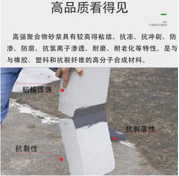 1. 耐久性与混凝土同步,利美聚合物耐久性高强修补料是由进口乳液和无机粉料双组分组成,是一种既具有高分子材料的粘接性,又具有无机材料耐久性的新型混凝土修补材料;