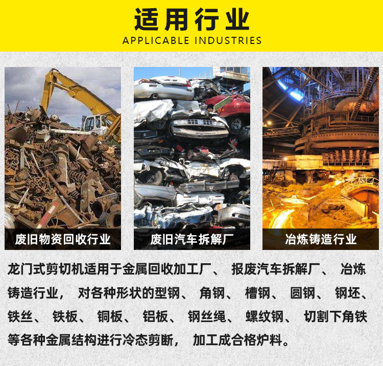 适用于金属回收加工厂、报废汽车拆解场、冶炼铸造行业,对各种形状的型钢及各种金属材料进行冷态剪断、切断处理。