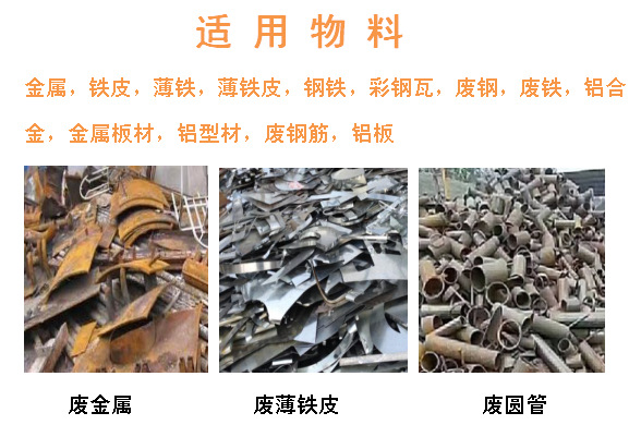 适用于金属、铁皮、铸铁、薄铁、薄铁皮、轻薄料、钢铁、彩钢瓦、废钢、废铁、铝合金、槽钢、角钢、角铁、铜板、金属板材、铝型材、废钢筋、铝板、铁板、钢板、圆钢、废旧金属。
