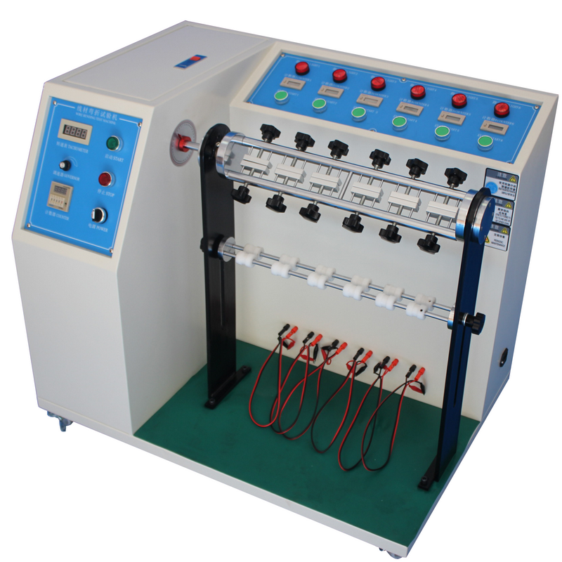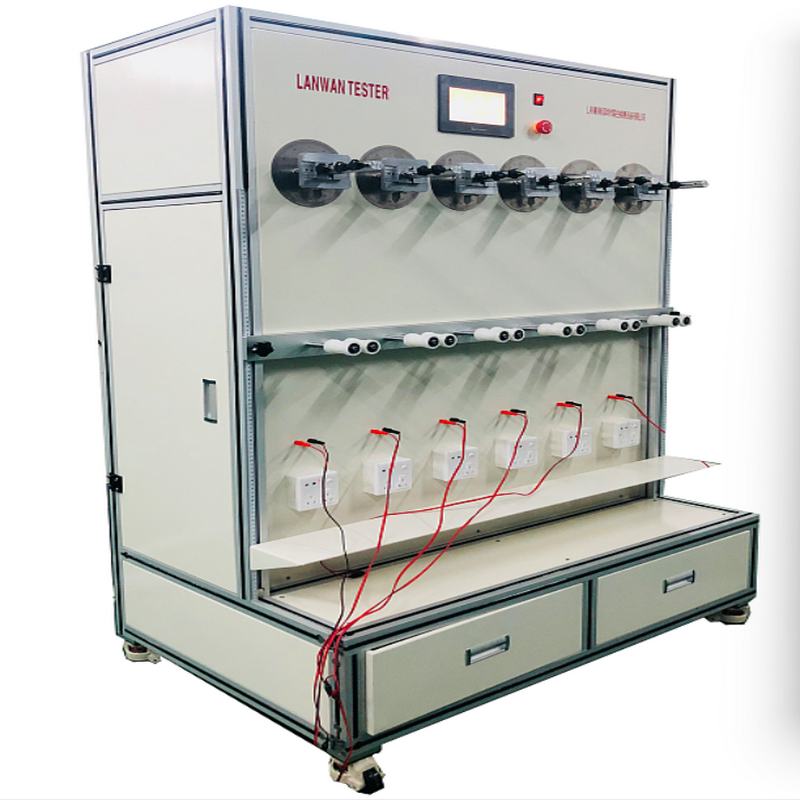 线材线缆摇摆扭转试验机适用于插头引出线、电源线、USB线、耳机线、音频线、耳机连接线等成品线材的弯折测试或摇摆测试。本机是将线材固定在夹具上,调节线材测试弯折角度及测试速度并加一定测试荷重,试验时左右摆动,经一定数次后,检测其断线率,查看总摆动次数,能自动计数,试料弯折至断线无法通电时,并能自动停止操作。线材弯折试验机符合UL817等有关标准“软线组件和电源软线通用安全要求"的规定及《通用技术标准GB/T14471-93》线材弯折测试。