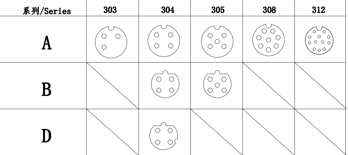 | 芯数 | 2芯/3芯(电流3A) | 4芯/5芯(电流3A) | 8芯12芯(电流1A) | 12芯(电流1A) |