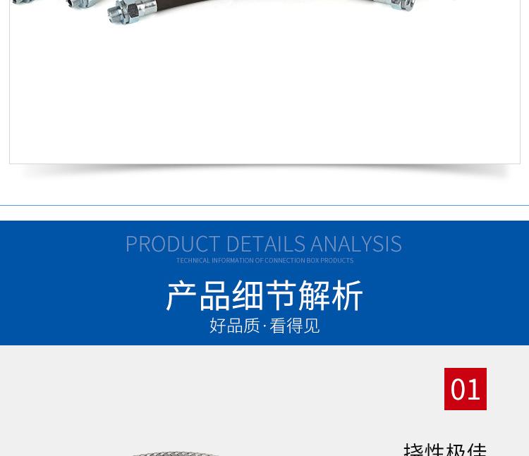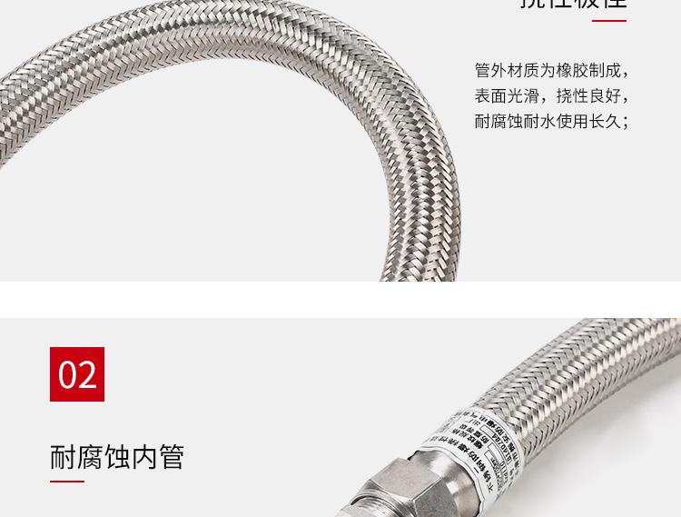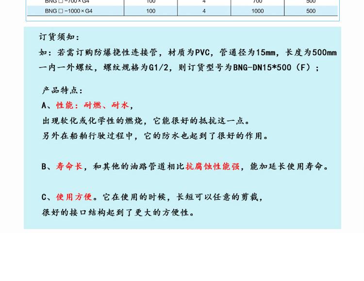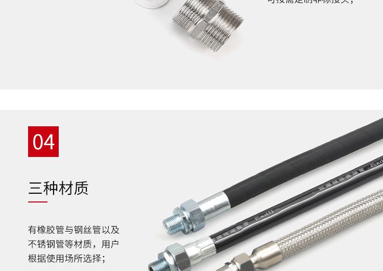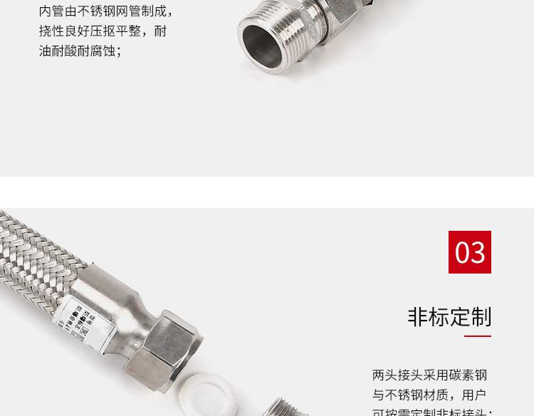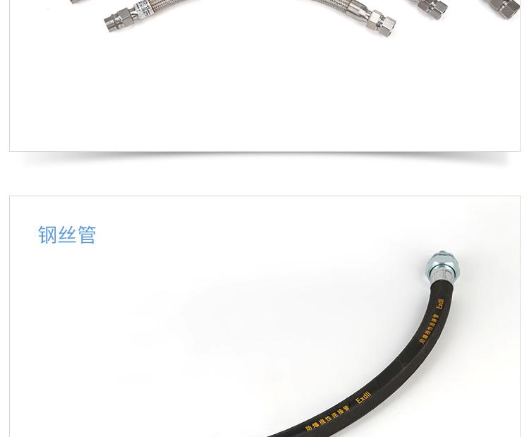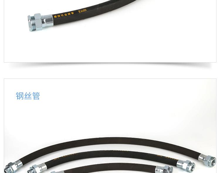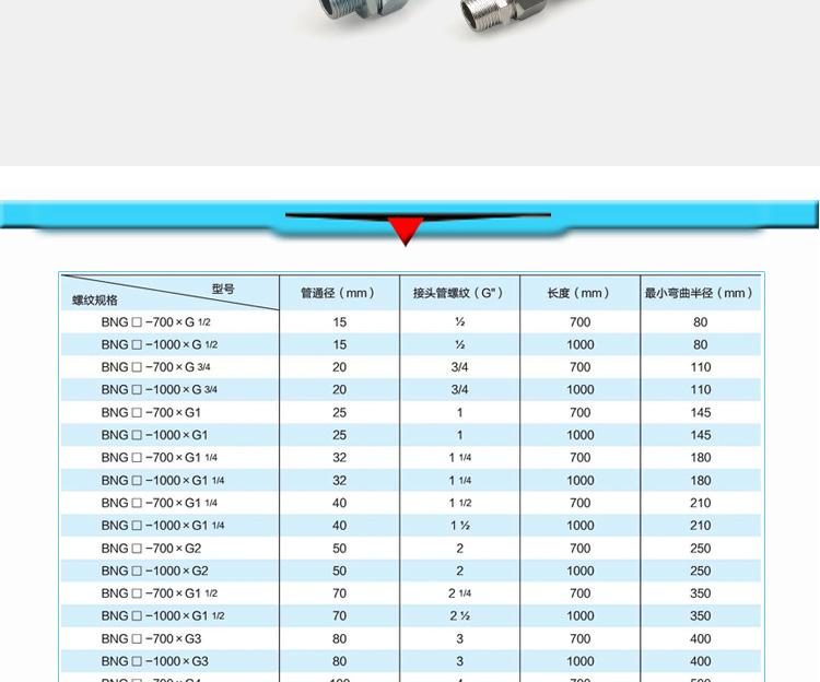 ?尺寸范围?:管径:6mm至300mm,常见型号如DN15(15mm)、DN25(25mm)等。?长度:常规500mm、700mm、1000mm,支持1m-6m定制。?最小弯曲半径:通常为管外径的5倍(如DN15管径弯曲半径80mm)。??材质与结构?:主体采用304或316L不锈钢波纹管,外层为不锈钢编织网,两端配不锈钢螺纹活接头。?壁厚0.5mm-3mm,防护等级IP65,工作温度-25℃~+55℃。??防爆性能?:防爆标志ExdII,适用于ⅡB/ⅡC级T1-T6组爆炸性气体环境(1区、2区)及可燃性粉尘环境(20区、21区、22区)。?螺纹规格支持G1/2"{text="G1/2""}、G3/4"{text="G3/4""}、G1"{text="G1""}等英制或公制定制。?