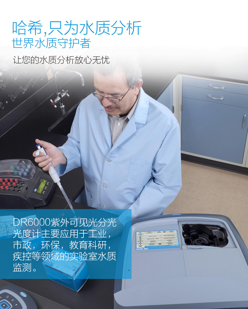 DR6000紫外可见光分光光度计是哈希公司2012年全新推出的第四代分光光度计产品,可在紫外及可见光区域进行水样的测定,具有优异的分析精度,实现了结果可靠与测量的统一。DR6000紫外可见分光光度计直观的菜单导航系统以及7英寸的彩色触摸屏使客户通过几个简单的步骤即可输入和校准自定义方法;支持定制化应用,可完全满足对精度要求苛刻的客户需要;内置AQA具有计划,管理和记录功能;支持以太网连接,可以快速的获取数据并进行实时的数据传输。该仪器可广泛应用于工业,市政,, 教育科研,疾控等领域的实验室水质监测。