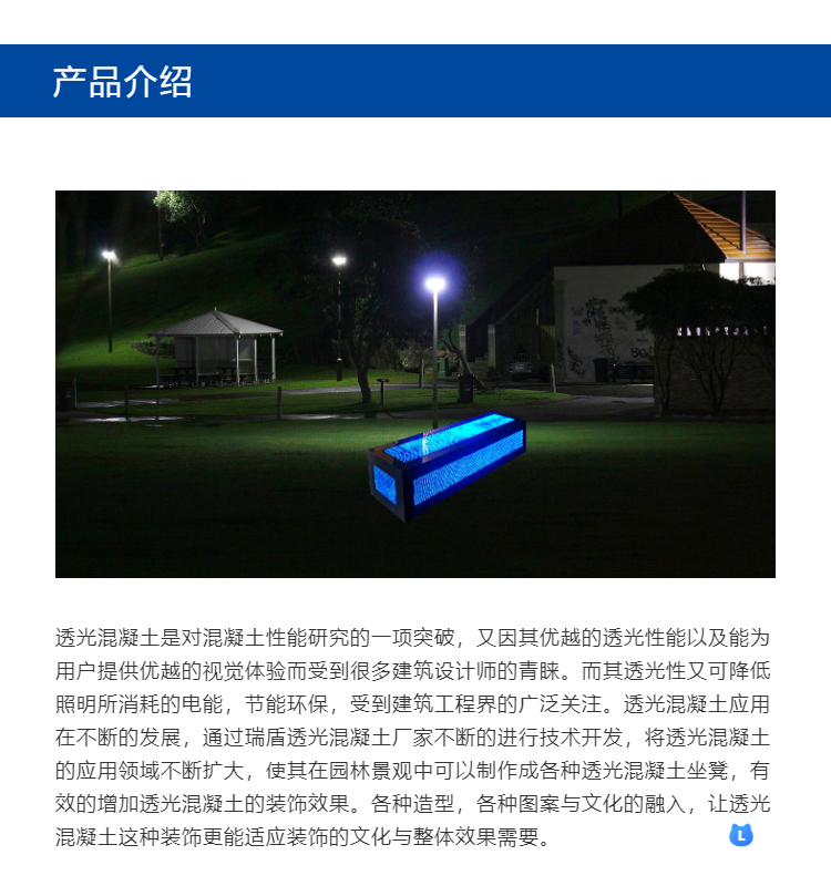 透光混凝土在园林中可以怎么应用呢?在园林景观中的透光混凝土在现代的应用已经非常的广泛了,在各种领域之中都有透光混凝土的身影,如地面、坐凳、装饰小品、导视牌、花坛等等都可以通过工厂预制的透光混凝土来打造。跟随瑞盾小编的脚步,一起看一看透光混凝土这种材料在园林中的应用吧。
