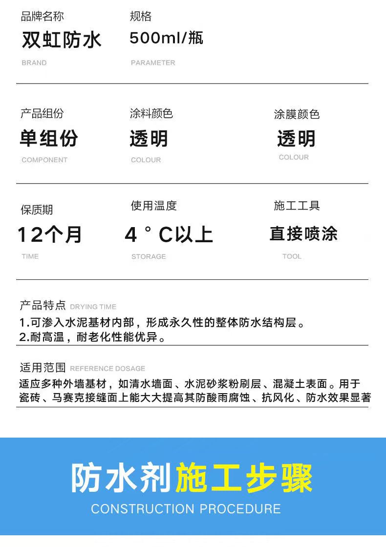 本产品喷涂在混凝土等多孔结构建筑表面,渗透到基材内部与金属离子反应形成稳定的枝蔓状晶体物质,有效的堵塞混凝土内部空隙,从而使基层结构密实,提高了混凝土的抗渗性。基面用了这个材料有荷叶效应的防水效果 。