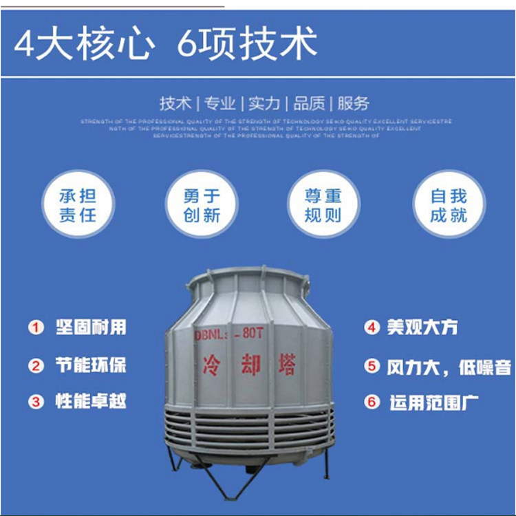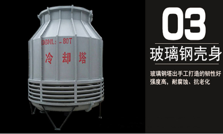 冷却塔简介:玻璃钢冷却塔耐腐蚀、强度高、重量轻、体积小、占地少、美观耐用,并且运输、安装和维修都较方便。因而被广 泛应用于国民经济各部门,对空调、制冷、空压站、加热炉及冷凝工艺等冷却水循环系统尤为适宜。产品详情:圆形逆流式玻璃钢冷却塔采用逆流式气热交换技术,填料采用的改性聚氯 乙波片,以扩散淋水面积;通过旋转布水方式,实现布水均匀,增强冷却效果。我厂曾对本系列产品的外形设计作过局部改进,使其更加运行可靠、耐用、装配方便.结构特征(1)塔体:型线合理,气流平稳,材质优良,色彩鲜艳,表面胶衣树脂内含有抗紫外线剂, 耐老化,强度高,重量轻,耐腐蚀。(2)填料:采用改性聚波片,横向增加了凸筋,水的再分配能力强,阻力小,热力性能 好,耐高温100度、低温-50度,阻燃性好。(3)旋转布水器及布水管:装有不锈钢球轴承,运转灵活可靠,水头低,布水均匀,采用PVC或玻璃钢制成的布水管。(4)风机:由清华大学工程力学系根据系列冷却塔参数设计的低噪声、高效率风机,铝合金 板翼型或玻璃钢叶片、噪声小、效率高。