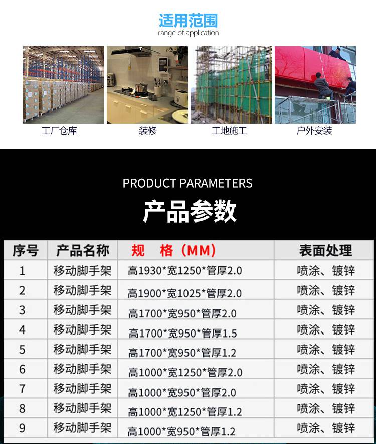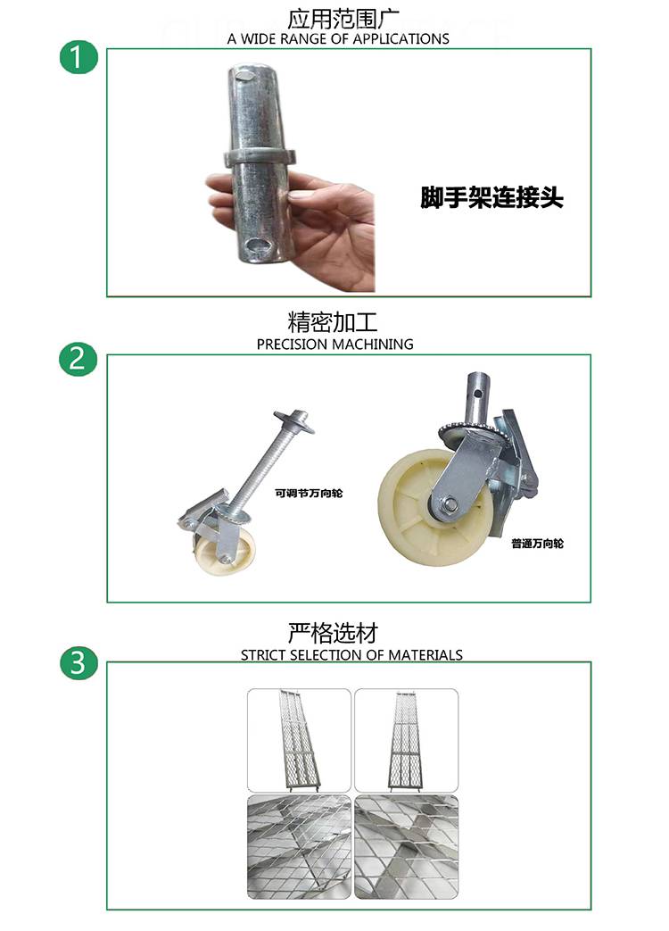 移动脚手架主要由主框,横框,交叉斜撑,脚手板,可调底座等组成。交叉拉杆又称斜拉杆、是纵向连接两副门架的交叉型拉杆。杆件两端压扁部分冲有销孔,组装时与门架立杆上的锁销锁牢。表面处理:电镀(冷镀锌)、 浸锌(热镀锌)脚轮:又称为地轮,可安装在移动脚手架下部,组成移动式脚手架.可作为机电安装.油漆粉刷.设备维修.广告制作的活动工作平台.脚轮为6寸带刹车,具有使用方便.移动灵活.安全可靠等特点.