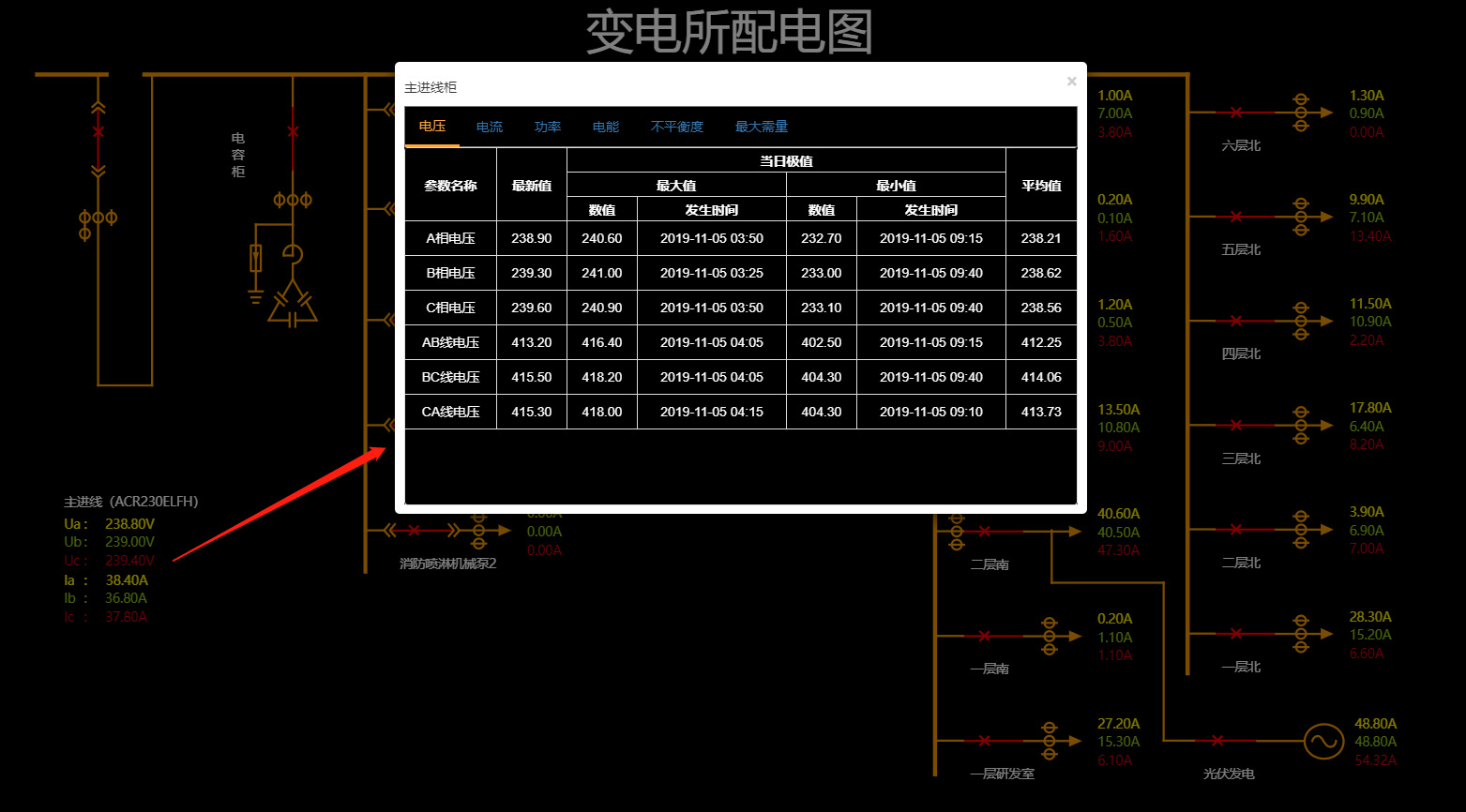 4.1.1 通过矢量配电图监测变电所用电情况,画面响应遥信变位、遥测越限报警,点击某个配电回路后可以查询该配电回路的各类详细用电参数。