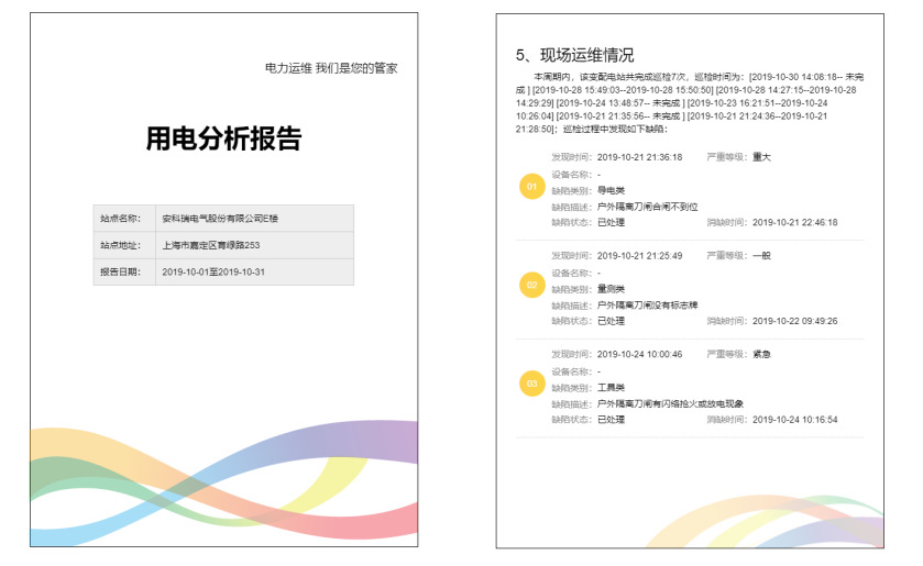 系统自动汇总变电所一个月的运行数据,对变压器负荷、配电回路用电量、功率因数、报警事件等进行统计分析,并列出在该周期内巡检时发现的各类缺陷及处理情况;