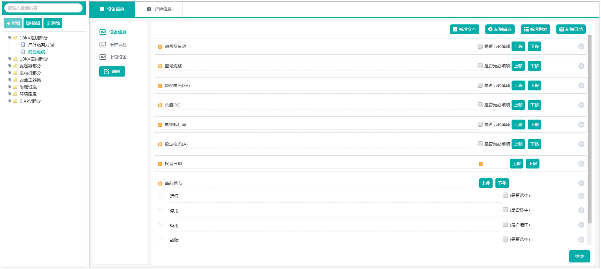 系统可配置每个变电所内变压器、进线柜、出线柜、计量柜、高压电缆等设备信息,记录设备的厂家、型号、投运日期等,并可灵活定义设备的巡检项、缺陷类别等信息;