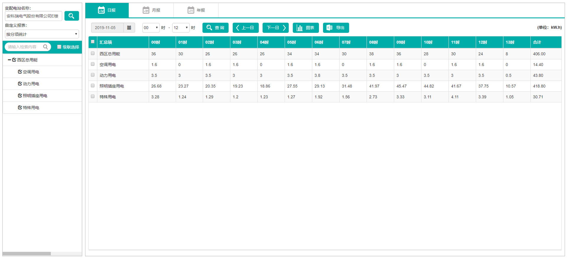 4.3.1 按照配电回路、区域、部门、分项(照明、空调、动力等)统计每时、每天、每月、每年用电数据,并进行同环比分析;