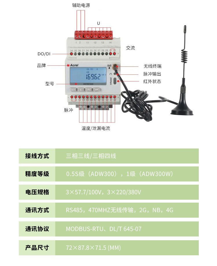 一、产品概述ADW300无线计量仪表主要用于中、低压网络的各类电参量测量及有功、无功计量,具有RS485通讯和多种无线通讯可选,方便用户进行用电监测,集抄和管理。可灵活安装于配电箱内,实现对不同区域和不同负荷的分项电能计量,统计和分析。