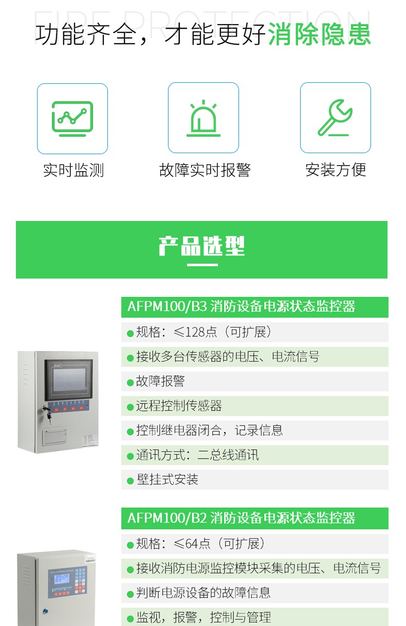 AFPM消防设备电源监控系统可有效降低消防设备供电电源的故障发生率,确保消防设备的正常工作,从而为在火灾情况下消防设备的正常运行、人员的疏散和营救提供有力的技术保障,AFPM消防设备电源监控系统将为消防设备“保驾护航”,起到有效保障人民生命和国家财产安全的积J作用。