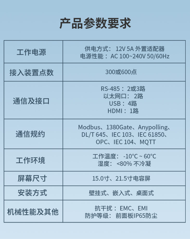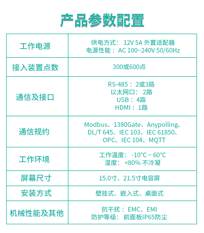 15.0寸;3个RS485口+2个以太网口 可接300台 上下行基础通信规约,15.0寸;3个RS485口+2个以太网口 可接300台 上下行扩展通信规约, 21.5寸;2个RS485口+2个以太网口 可接600台 上下行扩展通信规约 |
