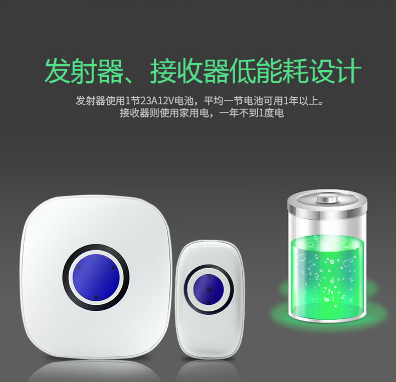 特点九:能耗,接收机一年不到一度电,发射器一节电池可用一到两年,可更换电池,产品寿命远远长于所谓不用电的门铃,电池超市、杂货店、电脑城,五金店均有售。