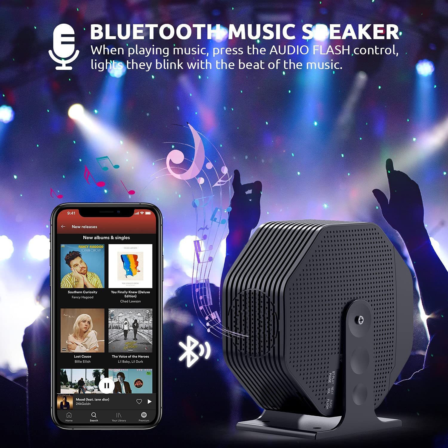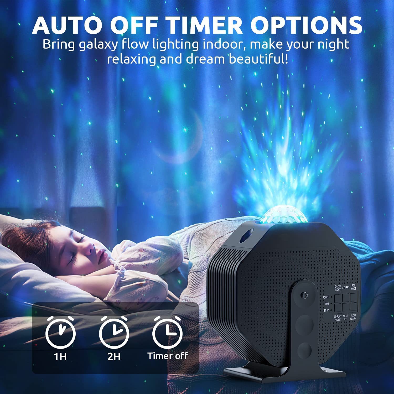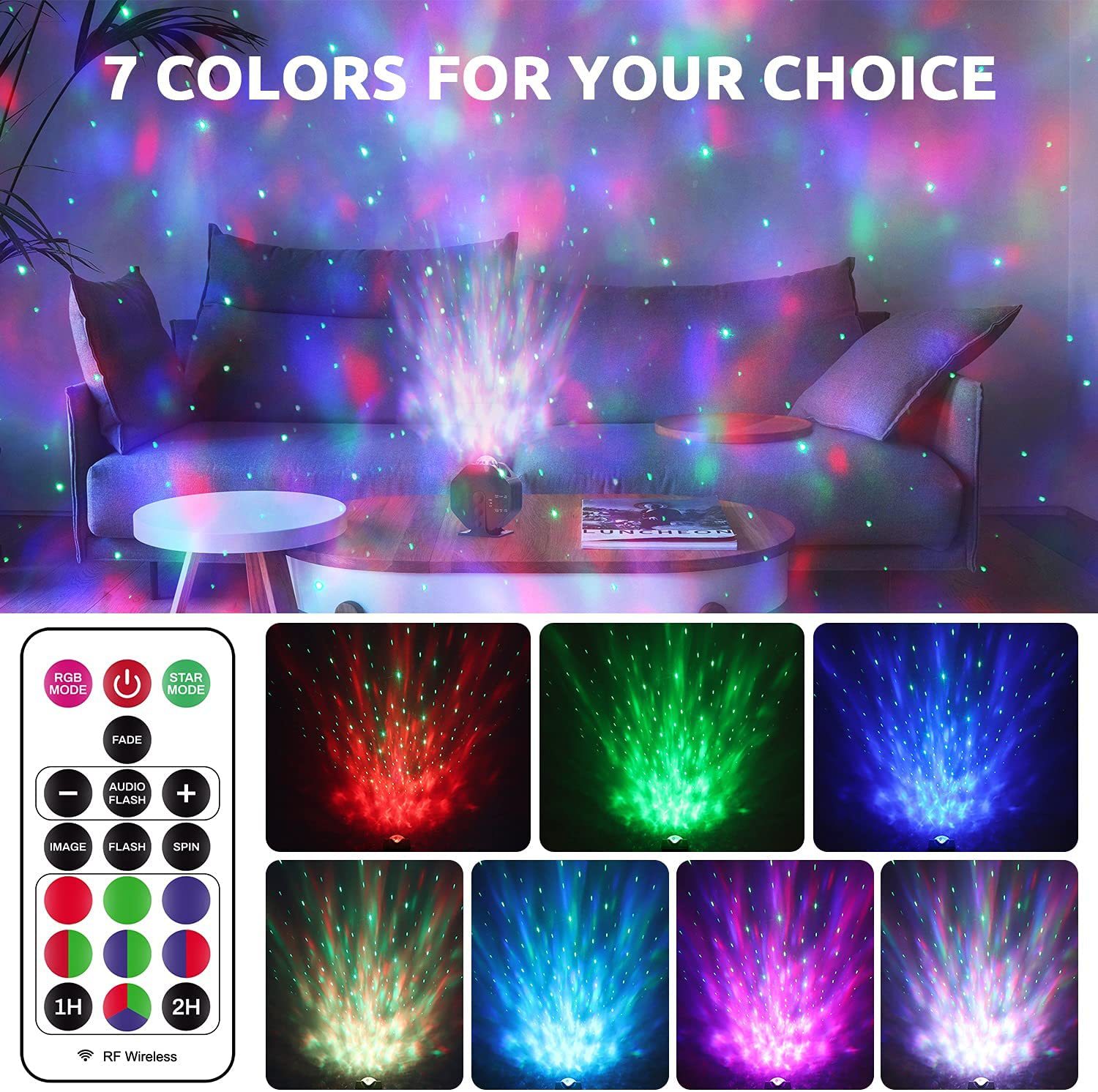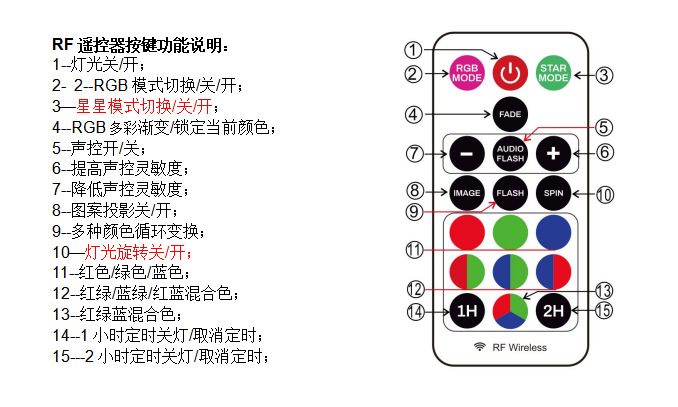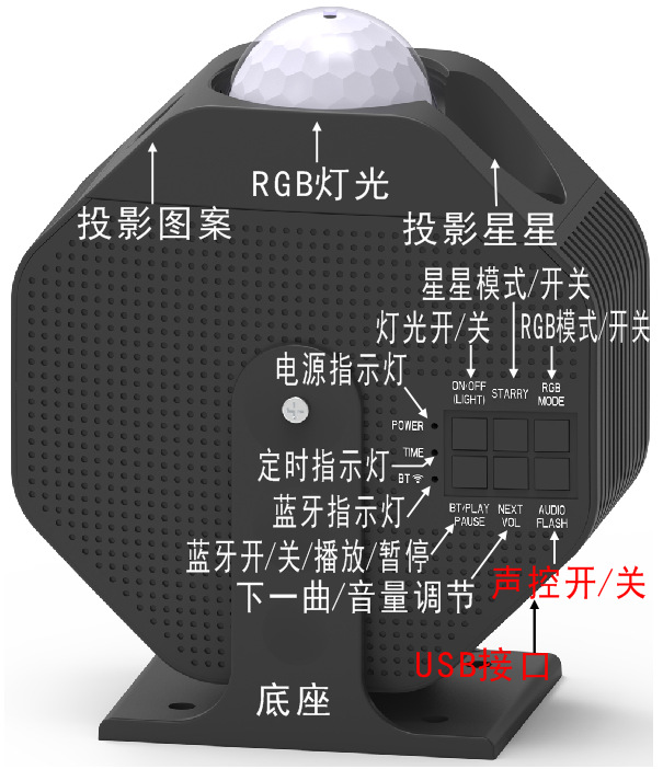 本产品可作为小型舞台灯光和氛围灯使用,也可作为蓝牙音响使用,适用于家庭、聚会场所和汽车内等场景,投影灯投影出满天星星的效果、通过LED灯光投影出图案、可切换多种RGB彩色灯光模式、支持声控闪灯模式(声控灵敏度可调节)、星星和RGB灯光可旋转、可定时关灯, 内置RF无线接收功能,可远距离全方位无死角对产品进行操控,内置蓝牙音响,可连接手机等蓝牙设备播放音乐,实现声光一体,营造出充满梦幻色彩和动感的场景。