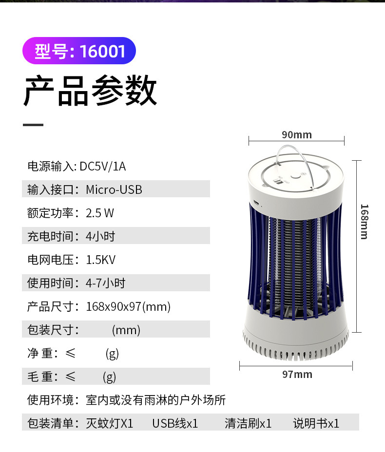 包装清单:灭蚊灯*1 usb线*1清洁刷*1 说明书*1