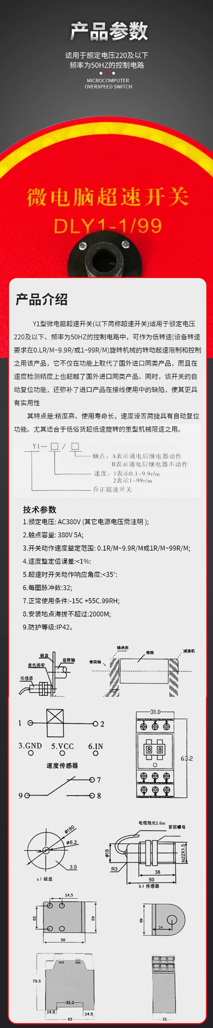 微电脑超速开关,如DLY1SH、QZY1等型号,适用于额定电压220V及以下、频率为50Hz(部分产品如QZY1为59Hz)的控制电路中。它们的主要功能是作为低转速(设备转速要求在0.1r/m~9.9r/m或1~99r/m)旋转机械的转动超速限制和控制之用,特别适用于低速或速旋转的重型机械。