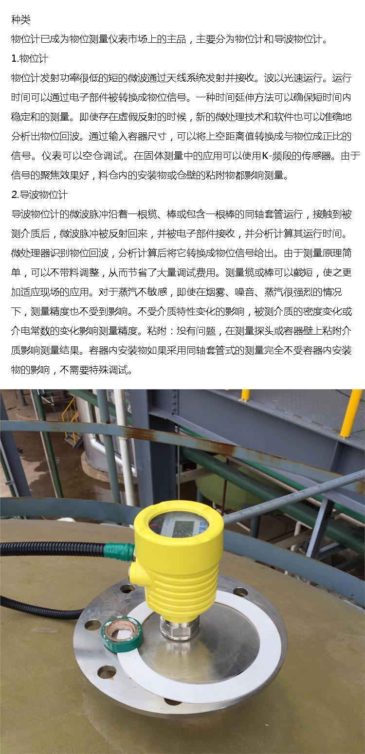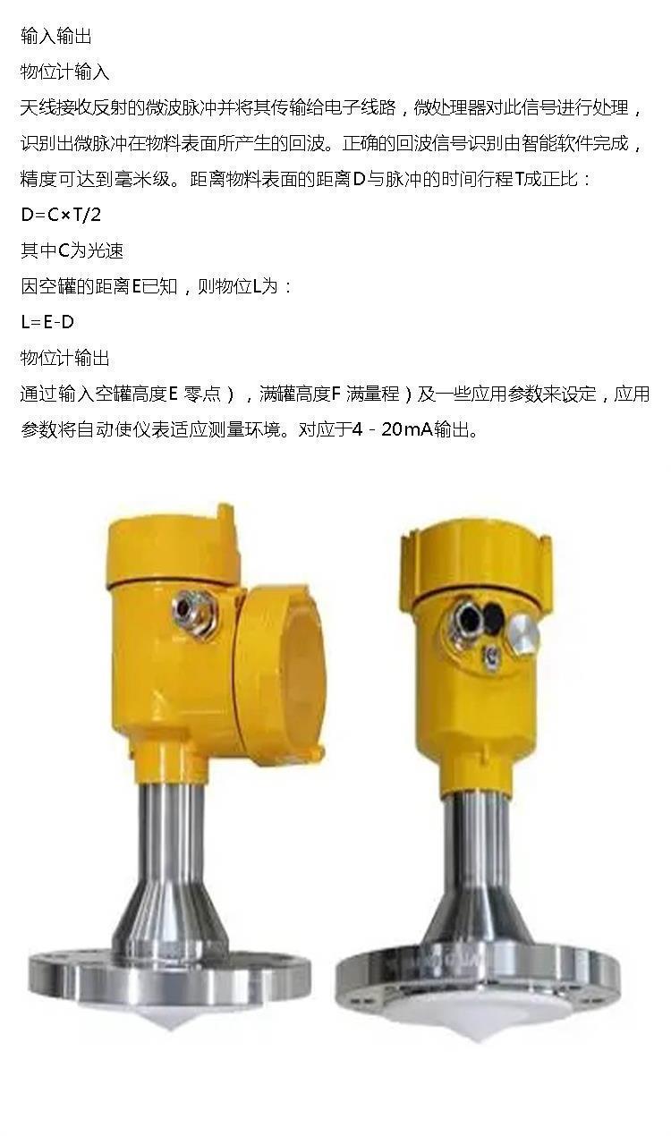 特点:通过谐振腔的振荡频率变化来测量物位高度或液位高度,适用于液态介质的测量,具有较高的测量精度。
