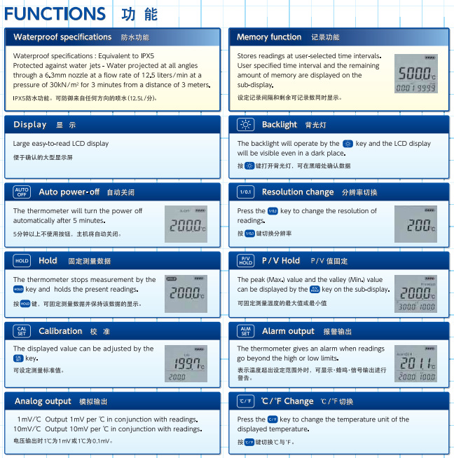 相当于IPX5(HD-1100、HD-1200、HD-1400)的防水性能出货时0℃特性测试精度为±0.2℃(附测试报告)国产的高品质和可靠性1 键 1 功能提高了手持型的“易用性” 。-易于查看的大型 LCD 显示屏-由于低功耗可连续使用 300 小时(在 HD-1200 上)配备存储器可记录 9999 个数据读数(在 HD-1200 上) HD-1500)您可以从 9 种间隔类型中选择,并在每次按键时手动测量数据。存储的数据可以通过专用软件导入计算机,并且可在主机上确认数据。CE标志兼容 -兼容10,000多种Anritsu Meter的温度传感器。此外,继承了尽可能消除传统型号误差因素的技术。输入部分使用与热电偶相同类型的金属。参考触点和参考触点补偿器集成在一起
