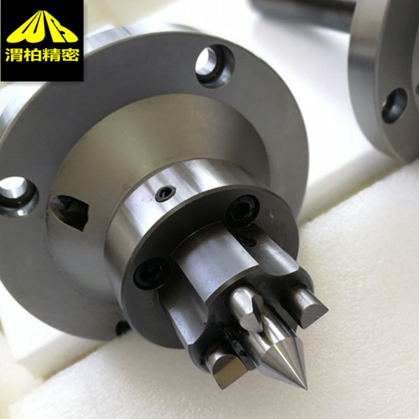 用户可选择莫氏锥柄、法兰连接和软爪夹持3种安装方式,在精车和磨削系列中,中心顶针固定,油(气)缸推动驱动卡爪嵌入工件端面, 配合尾座弹性回转顶针,加工精度可达μ级。