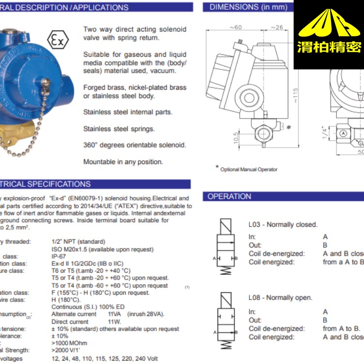 电气和机械根据2014/34/UE(“ATEX”)指令认证,适用于控制惰性和/或易燃气体或液体的流量。