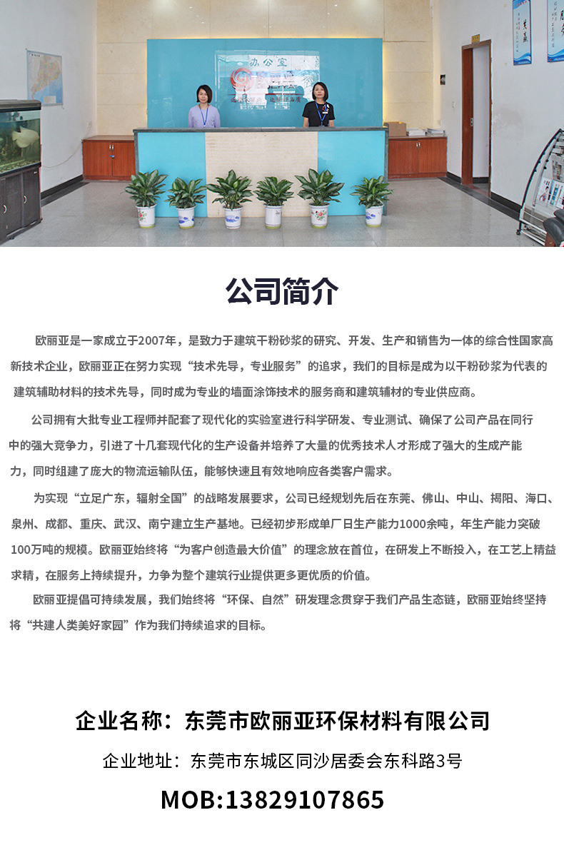 欧丽亚环保材料拥有从建筑基面到饰面等全产品线的干粉砂浆类辅材的生产应用技术。顺利通过国家ISO质量体系认证,,环境体系认证,职业健康管理体系认证以及通过国家相关产品的标准检测,并拥有多项国家相关技术专利和实用新型专利。东莞市欧丽亚环保材料有限公司提供从屋面到地面的全体系建筑材料,包括瓷砖粘结剂系列、聚合物内外墙腻子系列、防水抗渗类、节能保温类、地面隔音类、彩色填缝剂系列、石膏系列、饰面材料系列、干混建筑砂浆系列、界面剂系列、自流平砂浆系列十一系列产品。