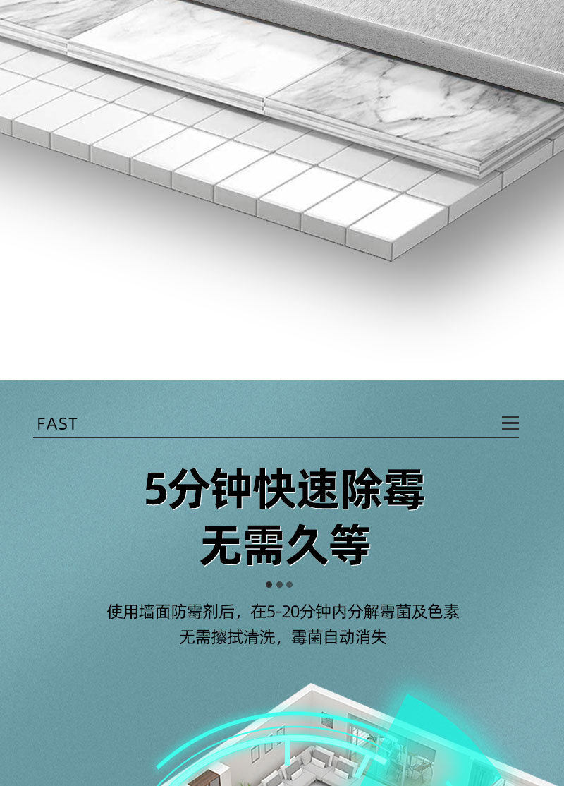 2,严重发霉:1KG/30平方,一桶可消除约700平方米的墙体霉斑;