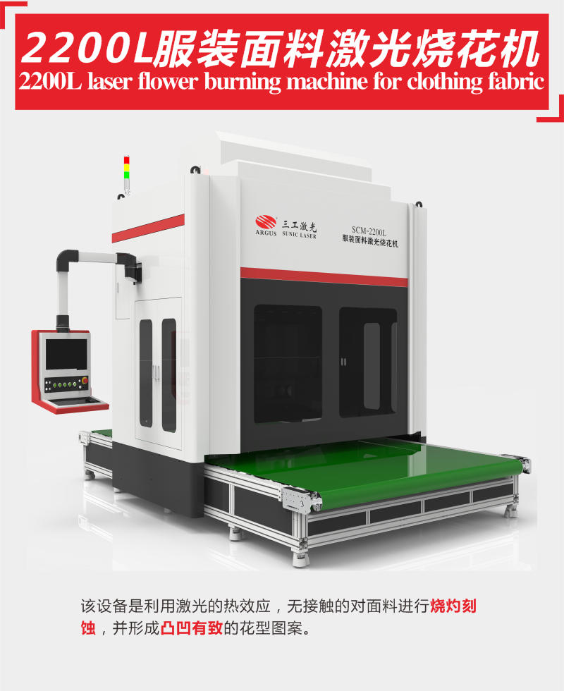 该设备是利用激光的热效应,无接触的对面料进行烧灼刻蚀,并形成凸凹有致的花型图案。