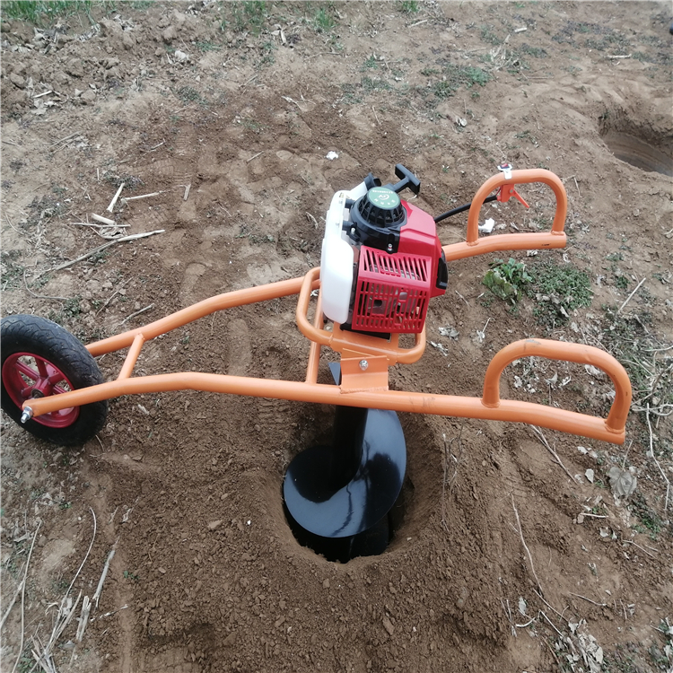 植树挖坑机单轮手推和双轮手推几种,其中操作手柄的设计,材料,高低,都符合大众人体的劳作模式,不会对人体产生过多的劳动强度,动力采用单杠风冷发动机,有二冲程和四冲程两种工作方式,根据配置主机功率的大小,配置相应合理的钻头使用,如果用大一号的主机,配置相应小一号的钻头,更能提高工作效率。