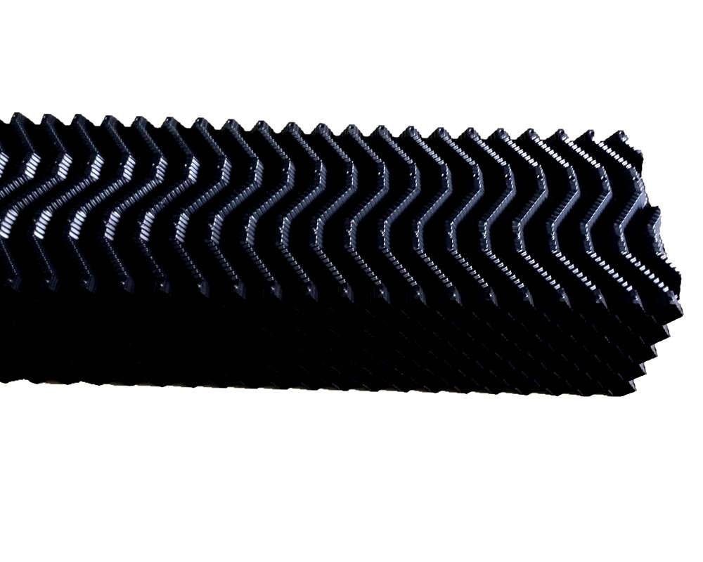 本公司散热填料有不粘接悬挂式,也有堆砌式,安装简便,便于清洗,且成功解决了粘接填料因吸尘积垢、自重而产生变形,且变形后积垢更加严重、难于清洗的问题。填料阻燃性能好,经检测:阻燃氧指数指标大于30。