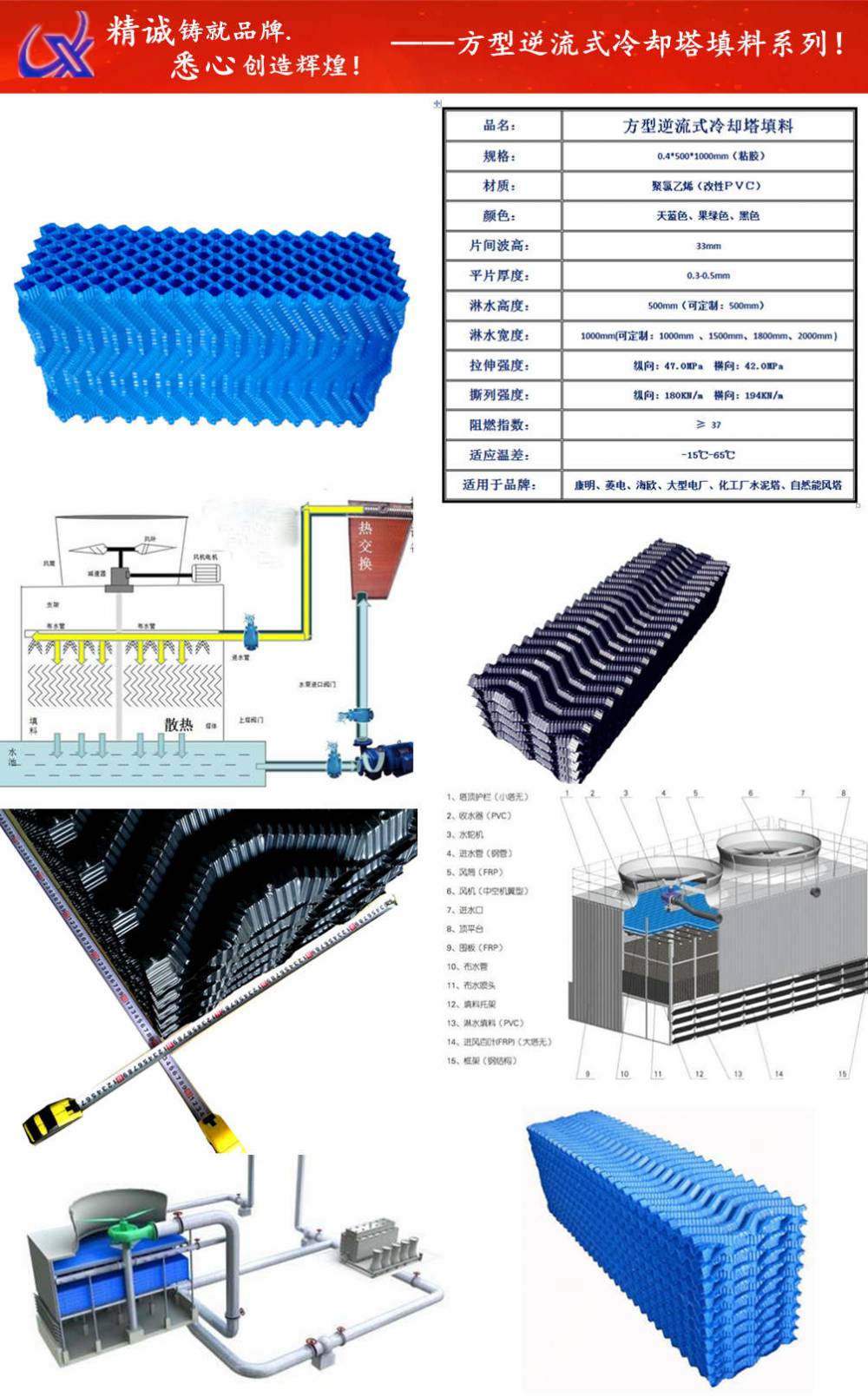 六、飘水率低于循环水量的0.001%,采用自带收水器及进风百叶三合一设计;该填料采用阻燃PVC真空吸塑而成,
