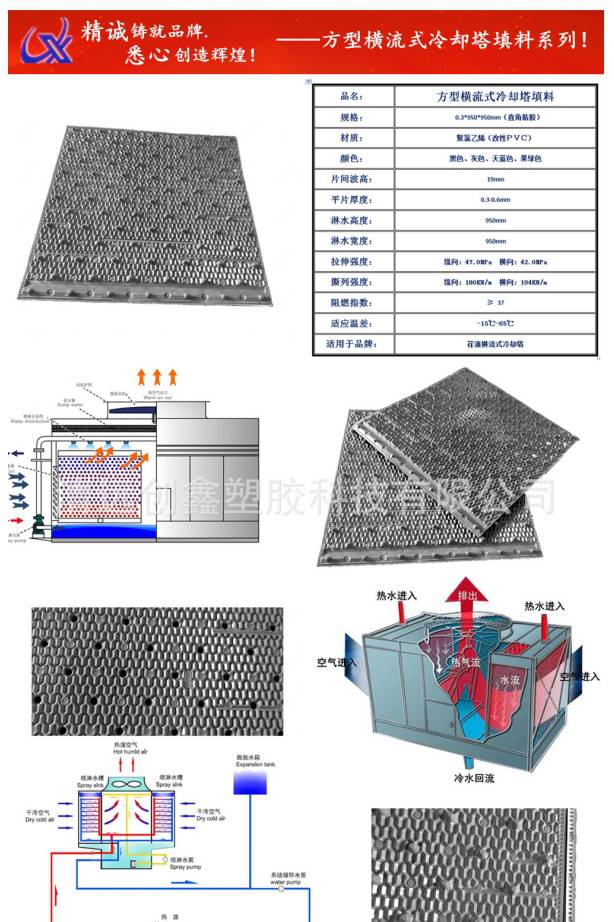 六、飘水率低于循环水量的0.001%,采用自带收水器及进风百叶三合一设计;该填料采用阻燃PVC真空吸塑而成,