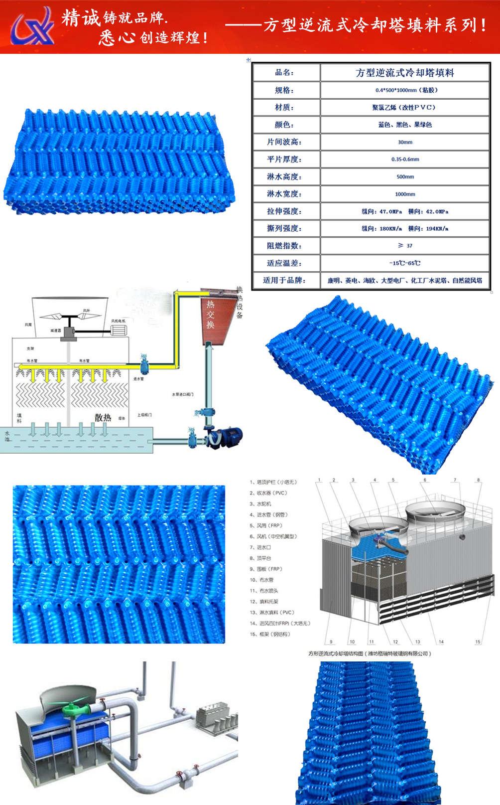 六、飘水率低于循环水量的0.001%,采用自带收水器及进风百叶三合一设计;该填料采用阻燃PVC真空吸塑而成,