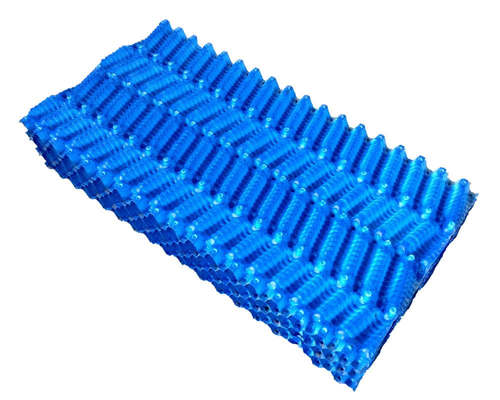 本公司散热填料有不粘接悬挂式,也有堆砌式,安装简便,便于清洗,且成功解决了粘接填料因吸尘积垢、自重而产生变形,且变形后积垢更加严重、难于清洗的问题。填料阻燃性能好,经检测:阻燃氧指数指标大于30。