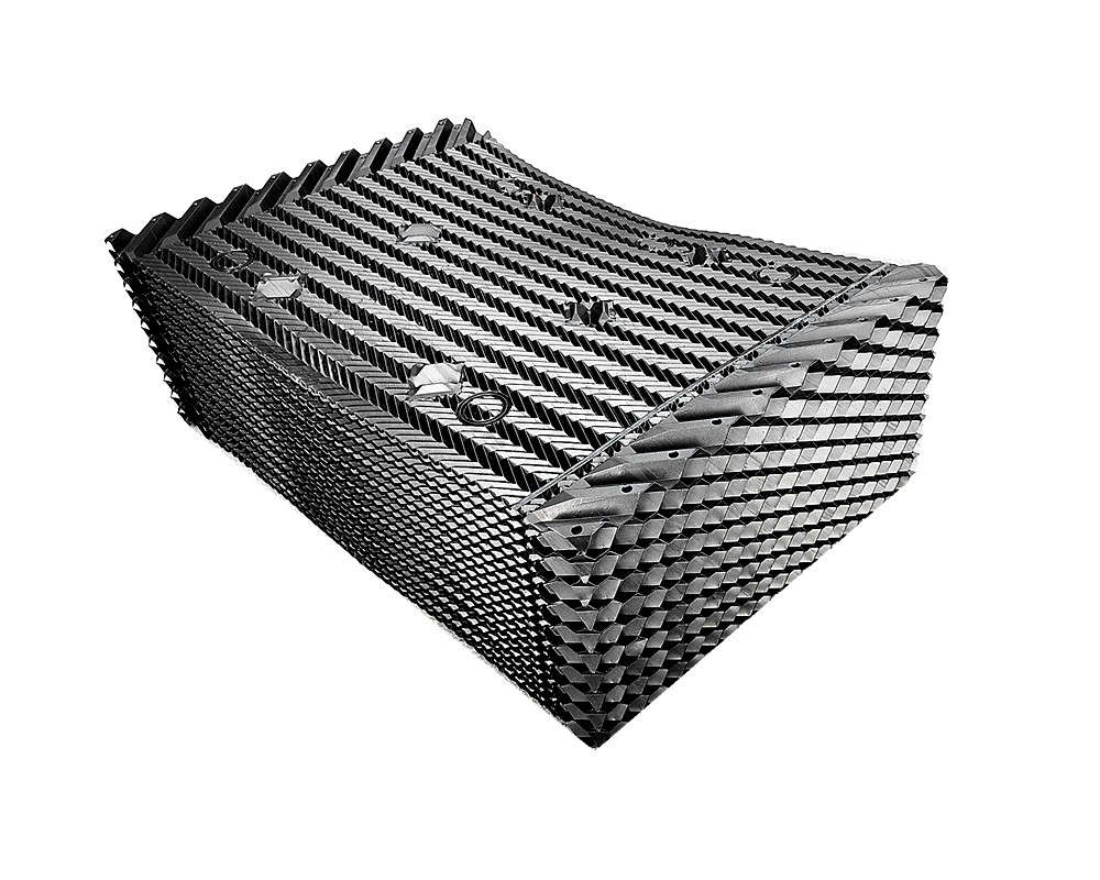 本公司散热填料有不粘接悬挂式,也有堆砌式,安装简便,便于清洗,且成功解决了粘接填料因吸尘积垢、自重而产生变形,且变形后积垢更加严重、难于清洗的问题。填料阻燃性能好,经检测:阻燃氧指数指标大于30。
