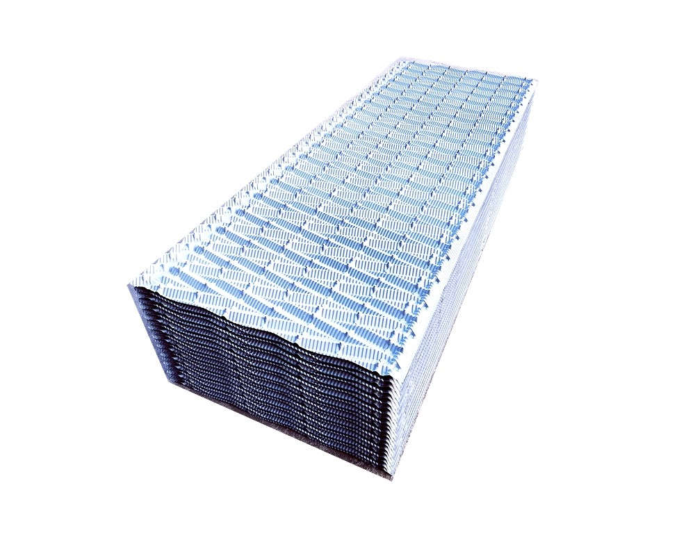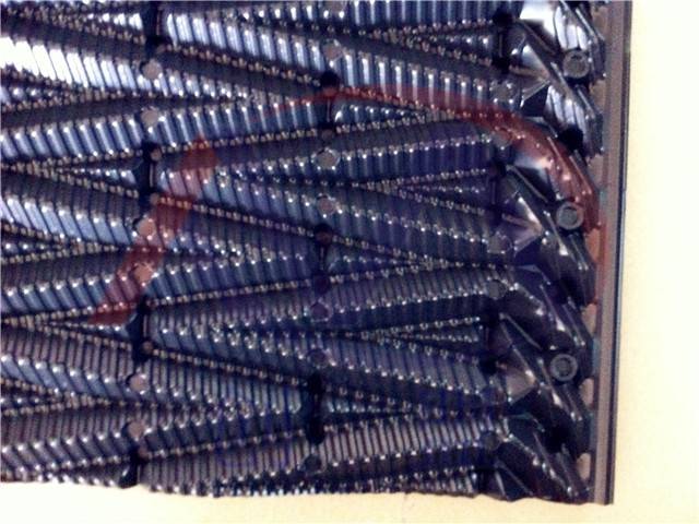 本公司散热填料有不粘接悬挂式,也有堆砌式,安装简便,便于清洗,且成功解决了粘接填料因吸尘积垢、自重而产生变形,且变形后积垢更加严重、难于清洗的问题。填料阻燃性能好,经检测:阻燃氧指数指标大于30。