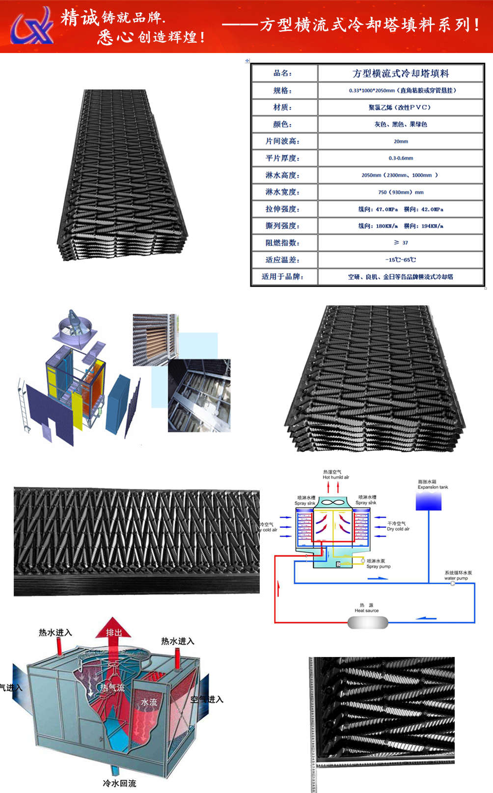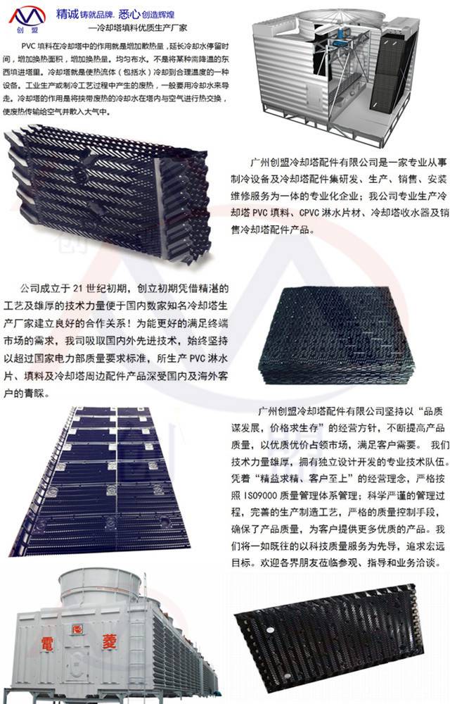六、飘水率低于循环水量的0.001%,采用自带收水器及进风百叶三合一设计;该填料采用阻燃PVC真空吸塑而成,